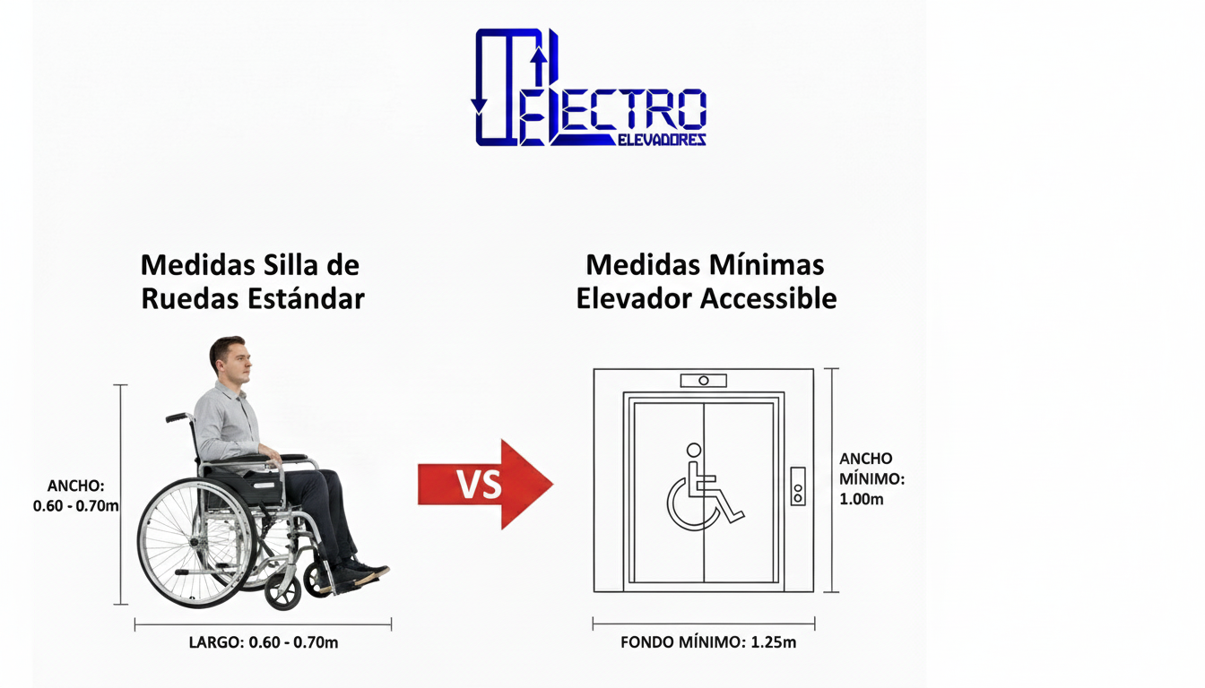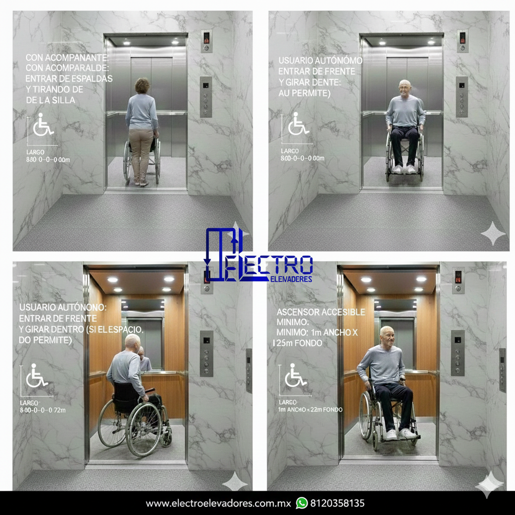 Para que un usuario de silla de ruedas acceda cómodamente, el ascensor no solo debe permitir la entrada de la silla (cuyo ancho varía entre 0.60 m y 0.70 m y largo entre 1.00 m y 1.20 m), sino que debe ofrecer suficiente espacio para la maniobra. En el caso de un acompañante, este debe poder entrar de espaldas y tirar de la silla con espacio para moverse. Para un usuario autónomo, la cabina debe tener un mínimo de 1.00 metro de ancho por 1.25 metros de fondo (como se observa en las dimensiones mínimas accesibles) para permitir el giro necesario dentro de la cabina, asegurando que el usuario pueda salir de frente, una maniobra mucho más segura que salir de espaldas. Priorizar estas dimensiones es crucial para ofrecer comodidad, seguridad y verdadera autonomía.
